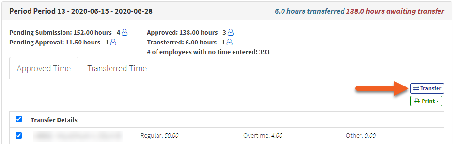 - Within the pay period, transferred time moves from the Approved Time tab to the Transferred Time tab.