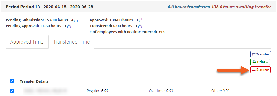 If you need to reverse transferred time in HRISMyWay, open the Transferred Time tab, select employees as required, and then select Remove.
